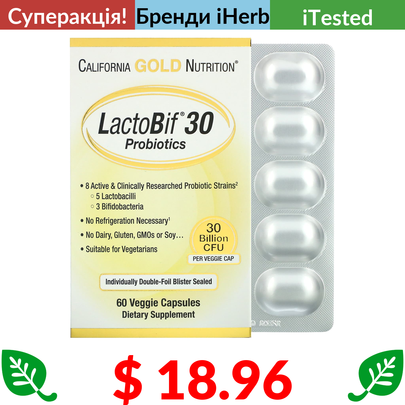 $ 18.96 California Gold Nutrition, LactoBif, пробіотики, 30 млрд КУО, 60 рослинних капсул