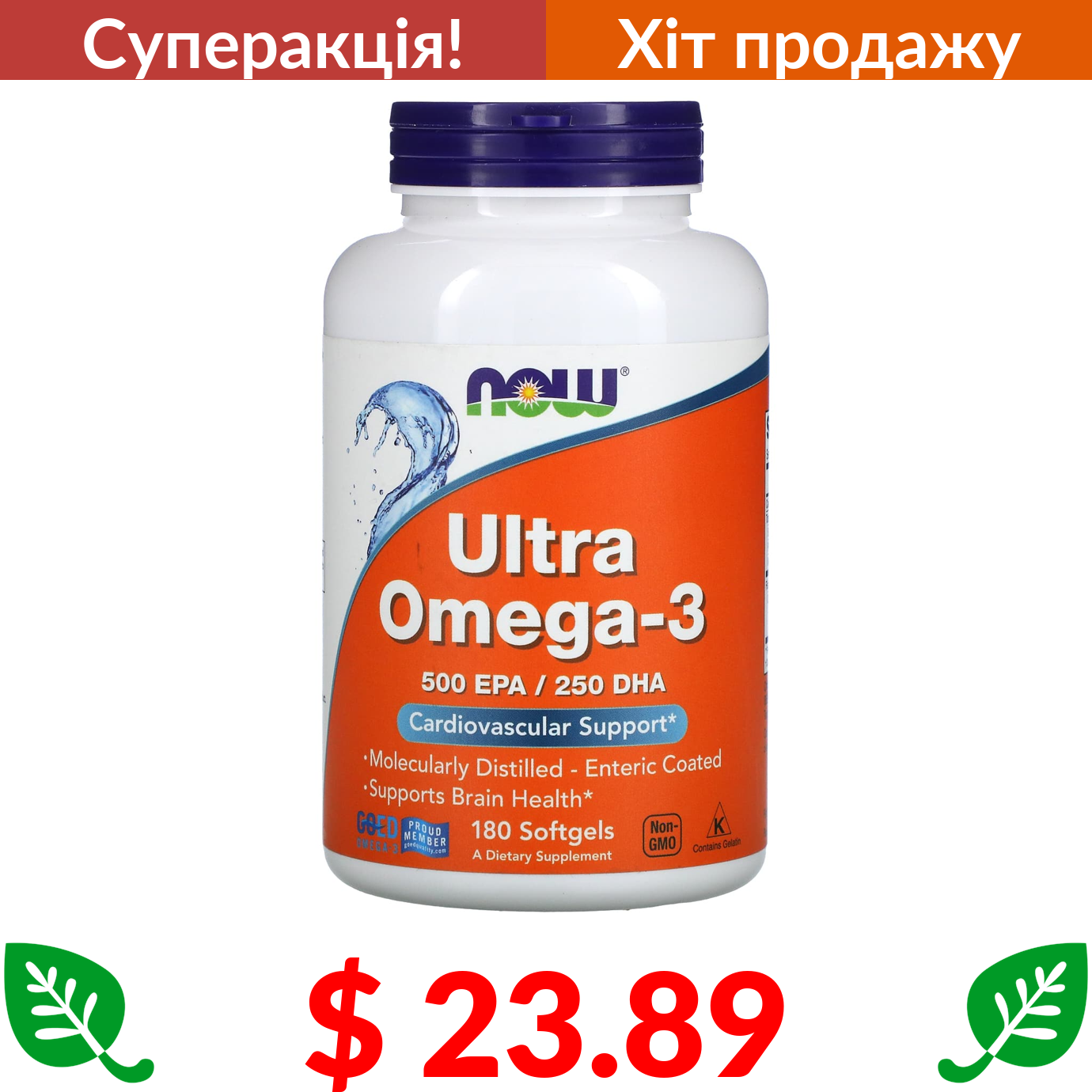 $ 23.89 Now Foods, Ultra Omega-3, 500 ЕПК / 250 ДГК, 180 капсул, вкритих кишковорозчинною оболонкою