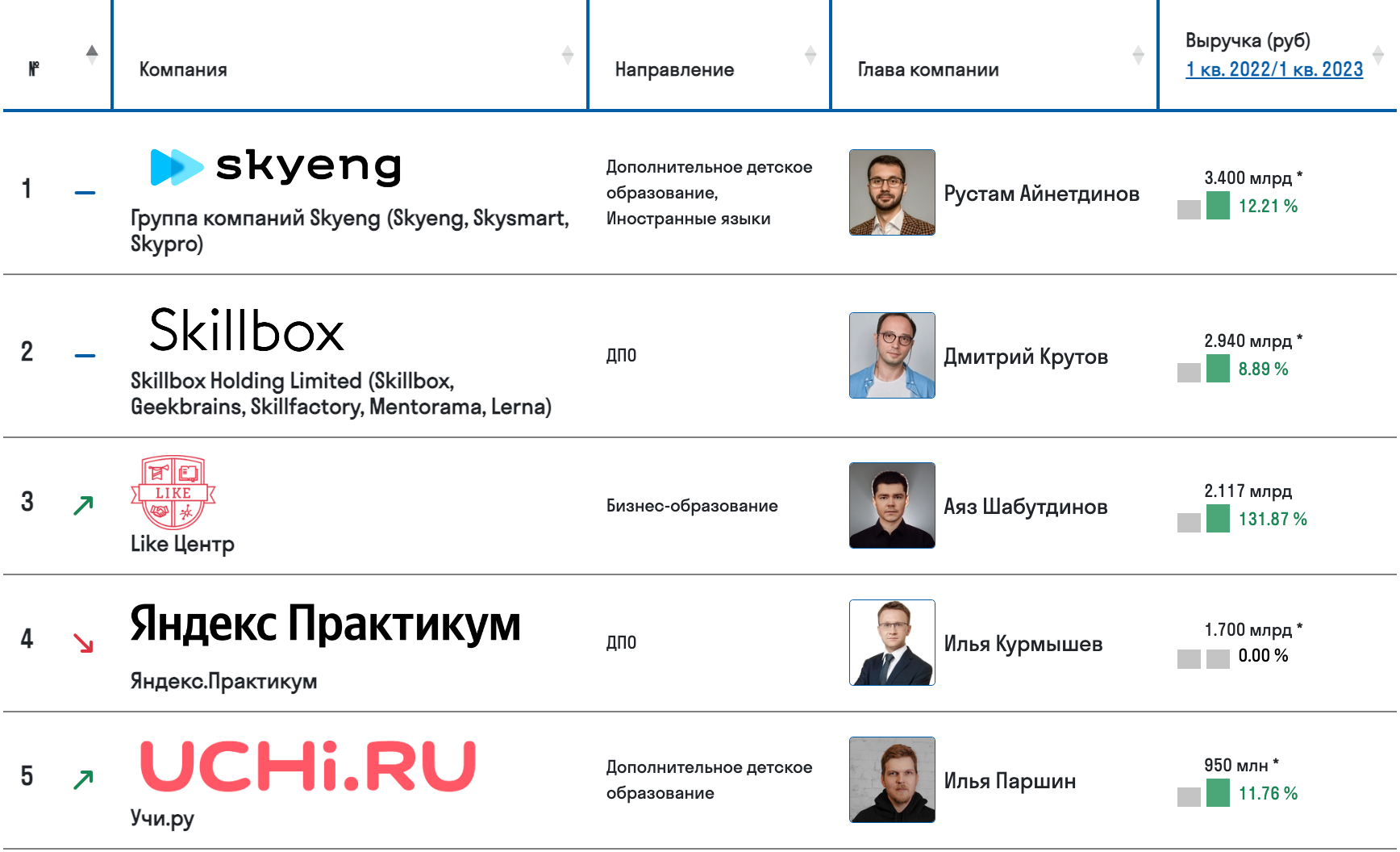 По подсчетам агентства Smart Ranking, в Q1'23 выручка группы компаний Skyeng составила 3,4 млрд рублей (+12,2% г/г) и превзошла выручку лидера 2022 года, группы Skillbox, принадлежащей ВК и заработавшей за тот же период 2,53 млрд рублей (+8,9% г/г). Одновременно место в тройке лидеров покинул Яндекс Практикум с ориентировочной выручкой 1.7 млрд рублей, уступив свою позицию бизнес-тренингам для предпринимателей Like Центра. Впрочем, мы не уверены, что последний не разделит в скором будущем судьбу Елены Блиновской.