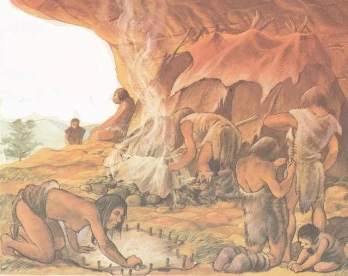 Быт древних людей. Дома строились из веток, придавленных снизу камнями или даже опиравшихся на каменные столбы. Также люди жили в удобных сухих пещерах, но только там, где они имелись. Внутри жилищ или у их входа сооружались костры. Огонь добывали с помощью трения одного куска сухого дерева о другой.
