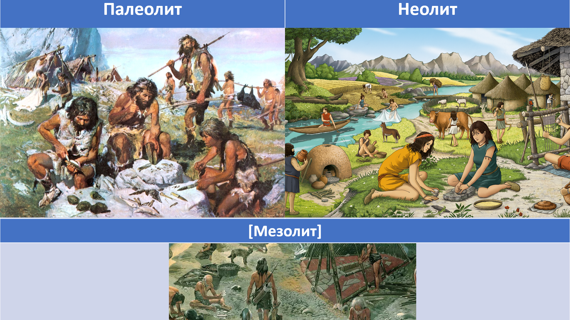Каменный век, в свою очередь, подразделяется на древний каменный век - палеолит, эпоху охотников и собирателей, и новый каменный век - неолит, эпоху перехода к земледелию и скотоводству. Между этими периодами для многих регионов земли выделяется средний каменный век – мезолит, эпоха охотников и собирателей, живших тогда, когда в других регионах планеты люди уже перешли к земледелию и скотоводству.