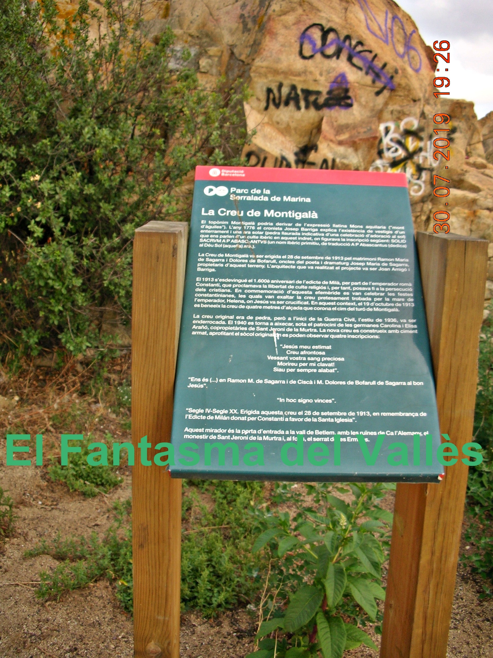 -Intermedio del Vallès: Traducció Simultània del cartell: -“Parque de La Serralada de Marina; La Creu de Montigalà: El topónimo “Montigalà” podría derivar de la expresión latina ‘Mons aquilaris’ (“Monte de águilas”). En 1776, el cronista Josep Barriga explica la existencia de vestigios de entierros i un ara solar (piedra labrada indicativa de una celebración de adoración al sol) que nos habla de un culto íbero en este paraje, dónde figuraba la siguiente inscripción: SOLID SACRVM A P ABASC-ANTVS (un primitivo nombre íbero, de traducción: A P Abascantus (dedica) al Dios Sol (aquella) ahora).
