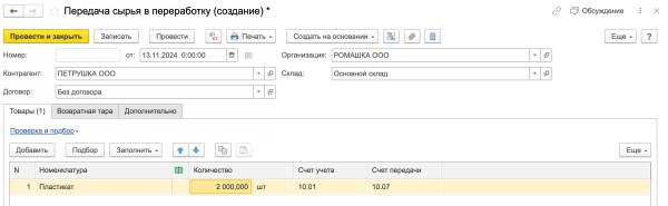 1 прием сырья