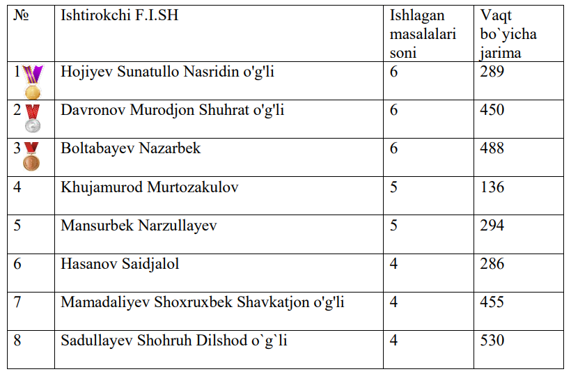 O'zbekiston bo'ylab o'tkazilayotgan 14 yoshdan 30 yoshgacha bo'lgan dasturchilar o'rtasida "ROBO CODERS 2019" 20-yanvar kuni bo`lib o`tgan 1-saralash bosqichidan FINAL yo`llanmasini egallagan g`oliblar ro`yxati