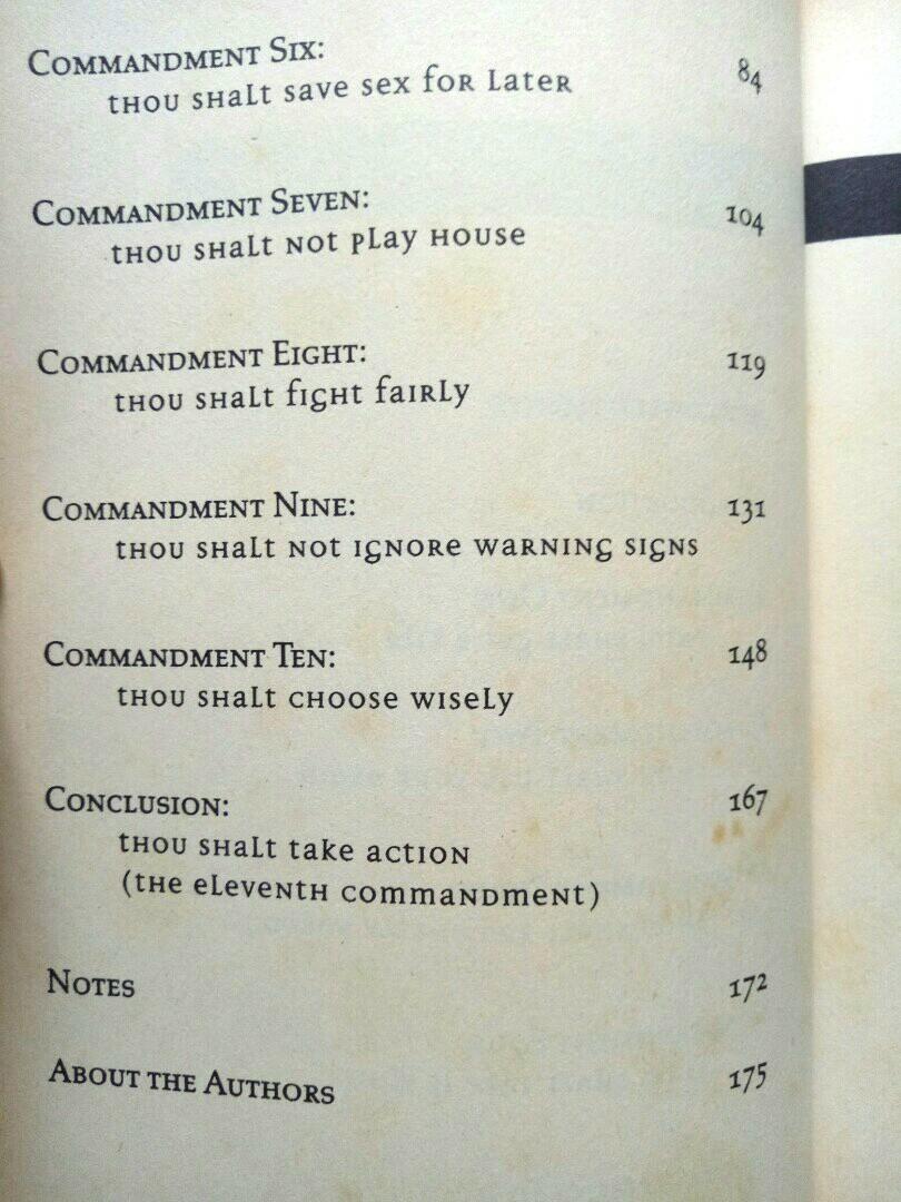 Puts dating in perspective - encourages the reader to make sure dating is never the primary purpose or focus point of their lives, and explains that dating is much more likely to be satisfying if both people have something to offer . A couple of other commandments : Set clear boundaries . Fight fairly .