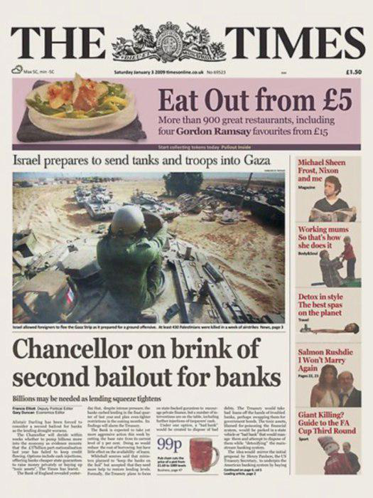 Фраза была взята из заголовка статьи в британском издании The Times. Речь в статье шла о том, как министр финансов Великобритании Алистер Дарлинг вынужден рассматривать новые меры по спасению банков в условиях экономического кризиса.