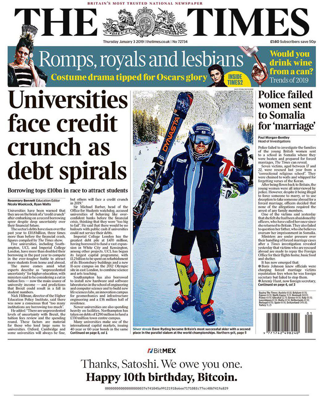 И в этот значимый для сообщества день биржа BitMEX решила поблагодарить создателя биткоина на передовице того же The Times