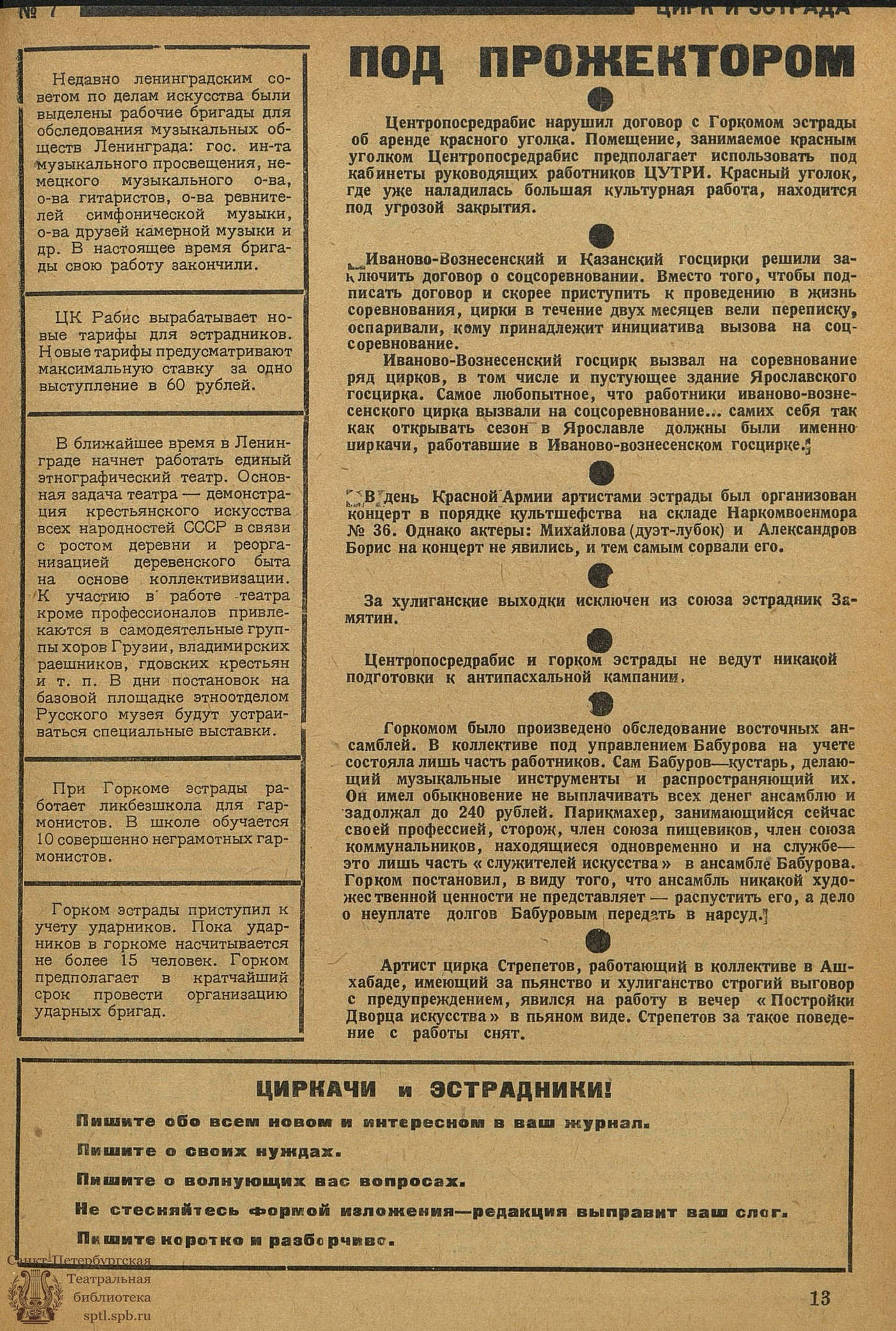 Иваново-Вознесенский госцирк вызвал на соревнование ряд цирков, в том числе и пустующее здание Ярославского госцирка. Самое любопытное, что работники иваново-вознесенского цирка вызвали на соцсоревнование... самих себя так как открывать сезон в Ярославле должны были именно циркачи, работавшие в Иваново-вознесенском госцирке.