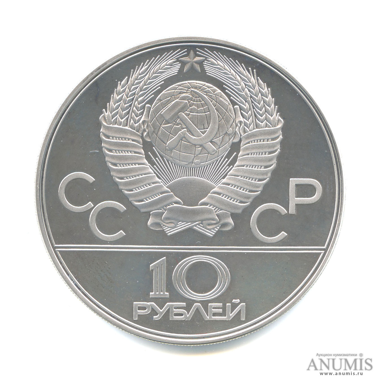 Сверху герб СССР с 15 витками ленты, слева от него буквы «СС», справа «СР», ниже двойная черта, под ней обозначение достоинства монеты цифра « 10 » и ниже слово «РУБЛЕЙ» .