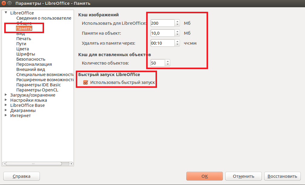 Если вы часто используете LibreOffice, то вы можете сделать его немного быстрее. Запустите LibreOffice и перейдите в параметры. В открывшемся окне выберите «Память», затем поставьте галочку напротив пункта «Использовать быстрый запуск» и увеличьте объём доступной памяти.
