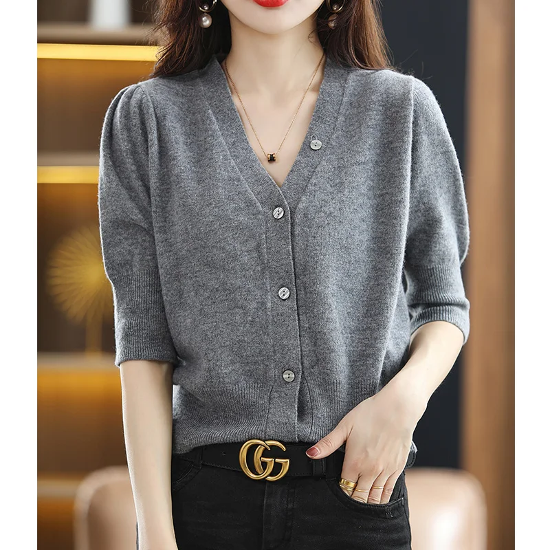 «100% Wool Sweater Women's V-Neck Cardigan Loose Knit Bottom Sweater Spring And Autumn New Button Half Sleeve Cashmere Short Top» по лучшей цене на рынке! Всего за 32$ (3040рублей)