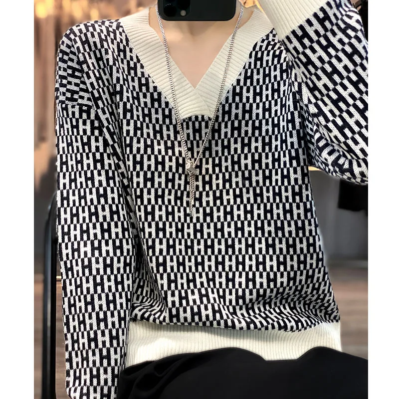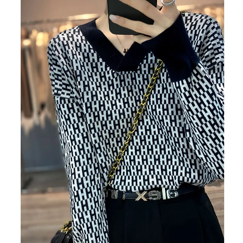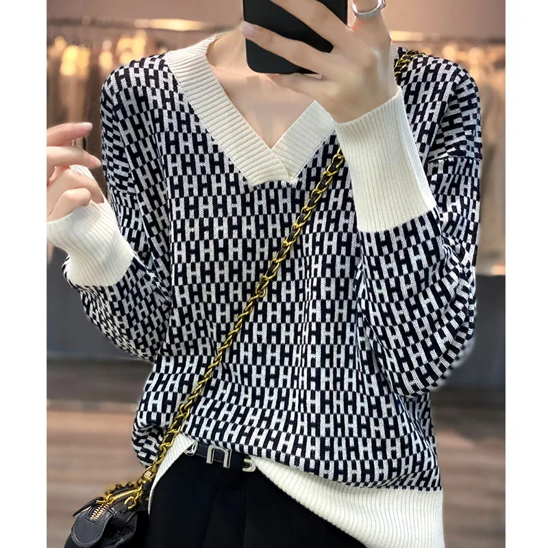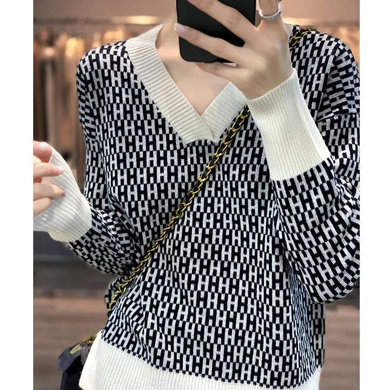 wmPYBaWcДолго искали 100% Worsted Pure Wool Ladies V-Neck Full Body Jacquard Letter Colorblocking 2022 Autumn/Winter Fashion Knit Sweater Loose Top, но не могли найти? Предоставляем вашему вниманию 100% Worsted Pure Wool Ladies V-Neck Full Body Jacquard Letter Colorblocking 2022 Autumn/Winter Fashion Knit Sweater Loose Top по лучшей цене на рынке!
