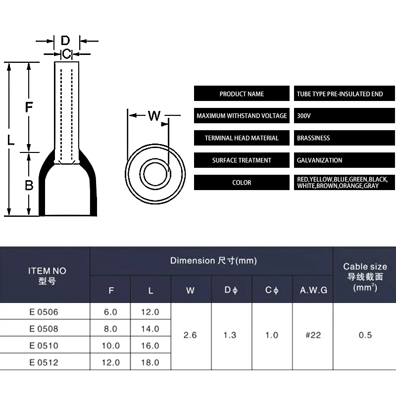 «1000 Pcs E0506 E0508 E0510 E0512 Crimp Terminals Insulated Ferrules Terminal Block Cord End Wire Connector For 0.5mm2 AWG 22» по лучшей цене на рынке! Всего за 7$ (665рублей)