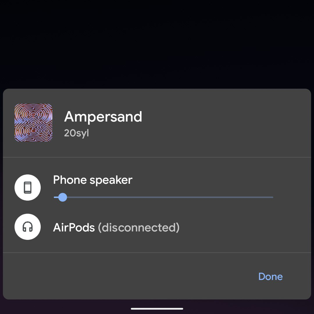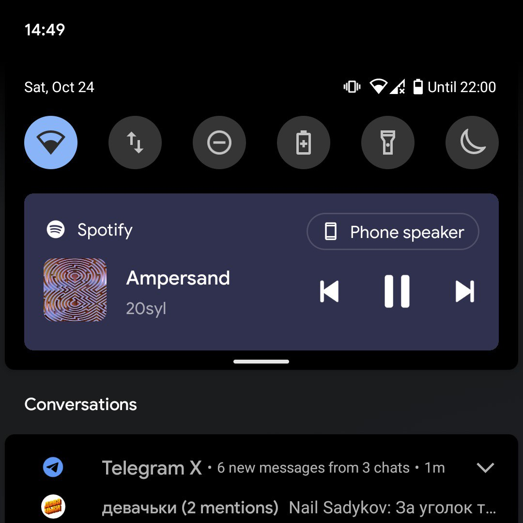 Плавно перейдем к новому плееру в уведомлениях. Теперь он часть быстрых настроек. И вседа выше всех уведомлений, а еще его можно сделать фиксированым и он всегда будет там. Так же повилась кнопка которая указывает где именно музыка играет, по клику на нее можно увидеть список всех устройств и регулировать громкость отдельно.