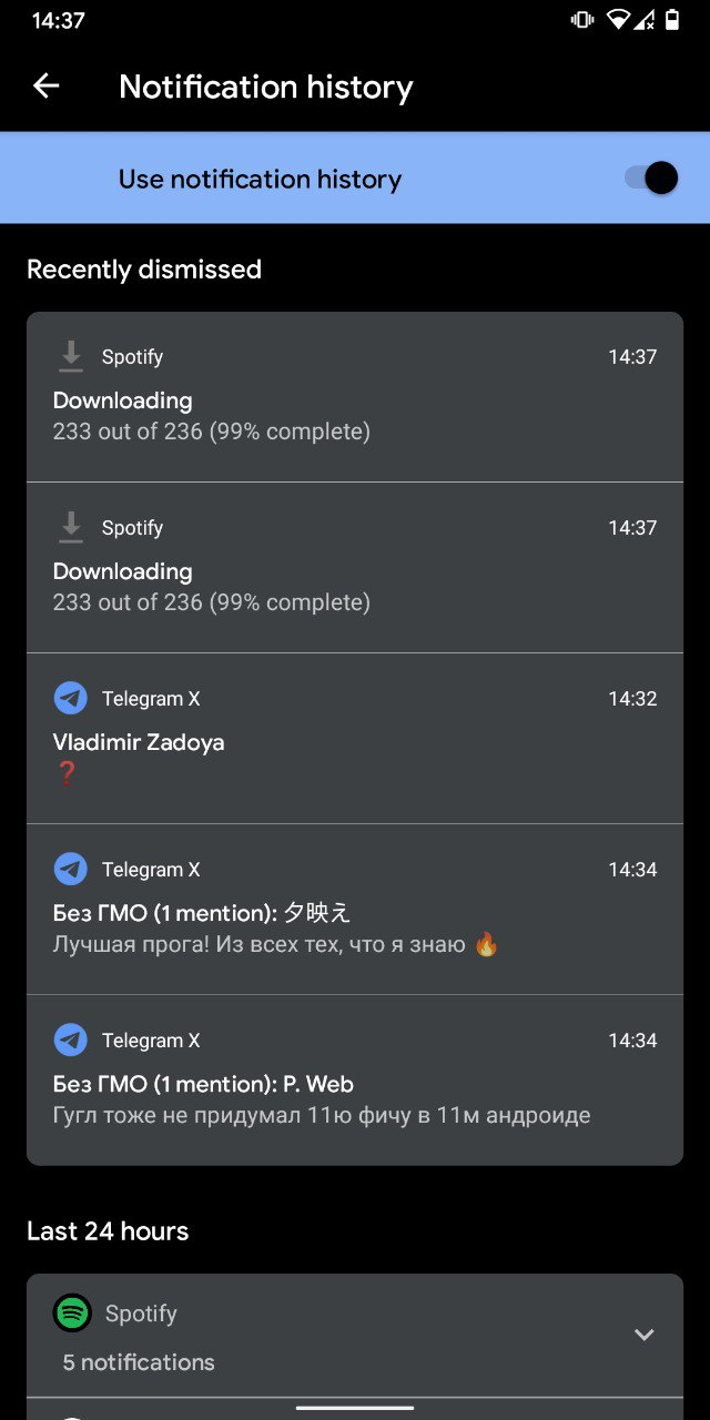 Так же появилась история уведомлений. К слову она была раньше, но ее сделали отдельным расделом с быстрым доступом. Если что-то случайно смахнули, или собеседник удалил сообщение (но пришло уведома), то можно прочитать.