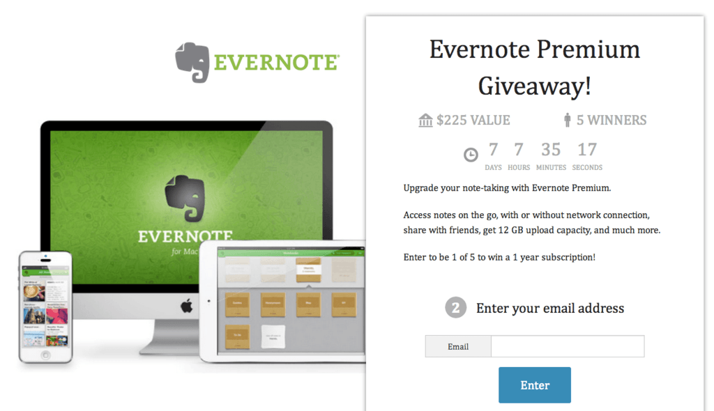Отличный пример у компании AppSumo Ноа Кагана. На этапе становления компании они разыгрывали макбуки, пожизненный доступ к Evernote, планшеты. Ребята из AppSumo создали плагин для проведения конкурсов KingSumo.