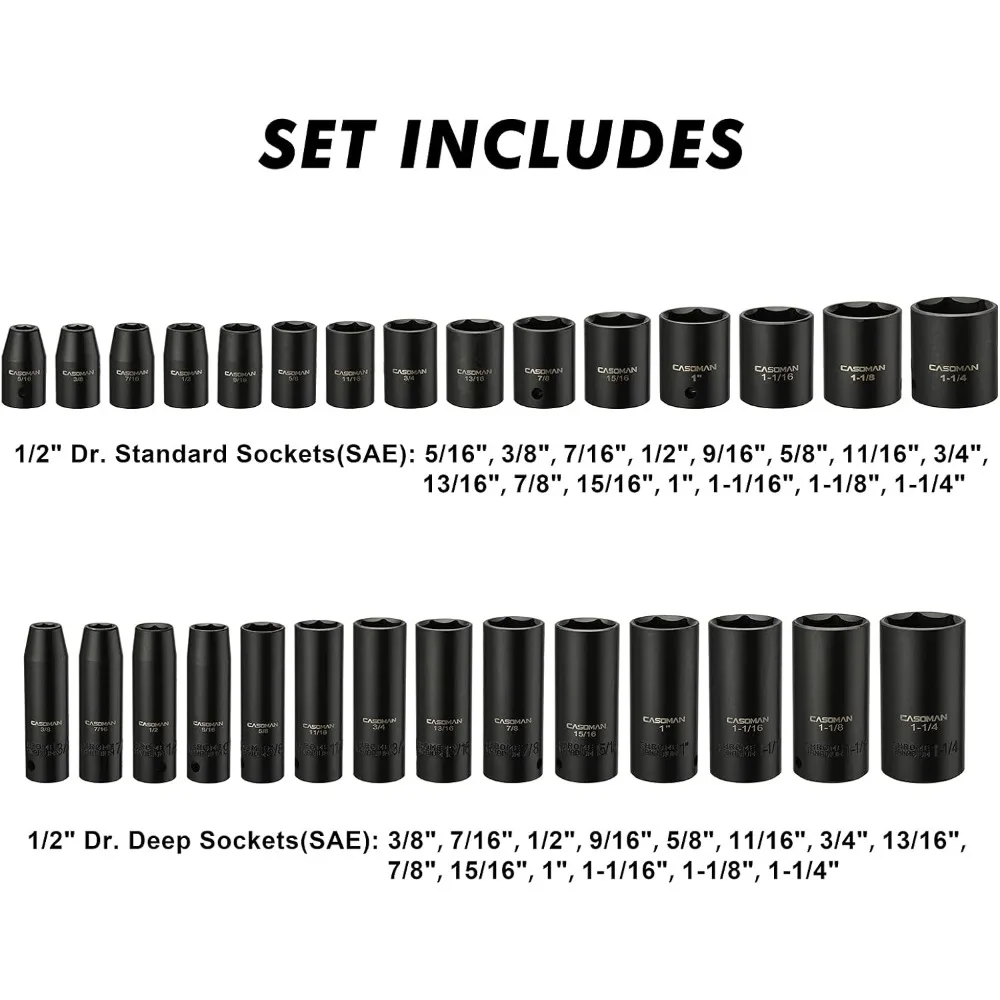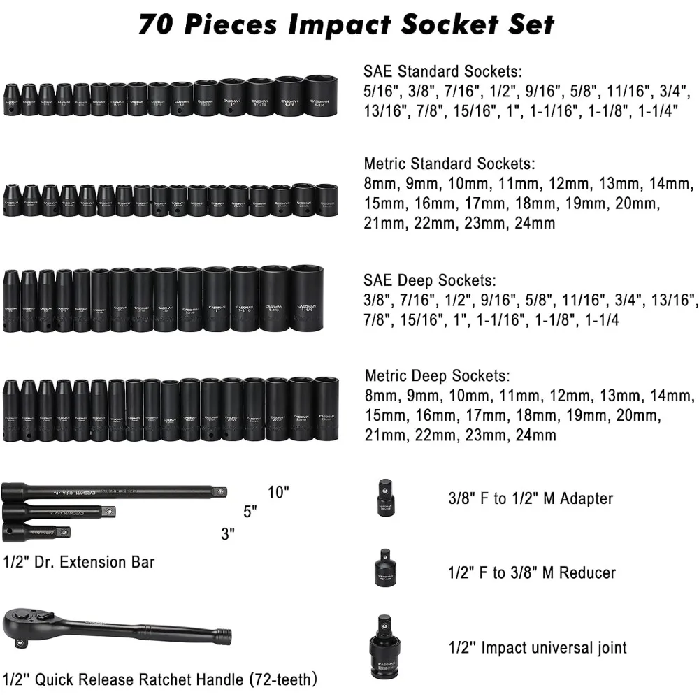 BSgHjrQuHere you can buy 1/2-inch 70 Pieces Impact Socket Master Set, SAE & Metric from 5/16"-1-1/4",8-24mm, Shallow/Deep Socket with Ratched Hand with free delivery to your post office.