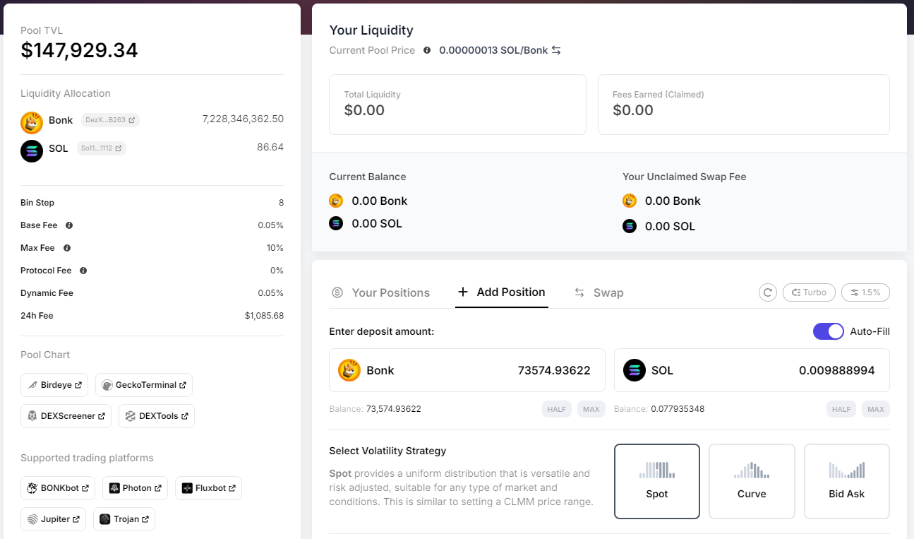 Мы загрузили Бонк и Сол на равное количество, и курс токена BONK идёт вверх.