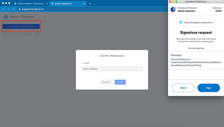 2️⃣ Create Namespace: простір імен є одиницею першого рівня в Glacier. Натисніть «Create Namespace» і назвіть простір. Зверніть увагу, що кожен простір імен є унікальним у системі. Ви отримаєте повідомлення про помилку, якщо ваше ім’я вже існує.