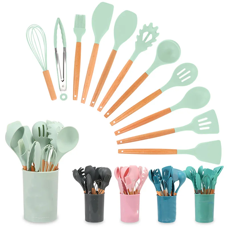 12Pcs Wooden Handle Silicone Kitchen Utensils With Storage Bucket High Temperature Resistant And Non Stick Pot Spatula And Spoon - Купить с бесплатной доставкой