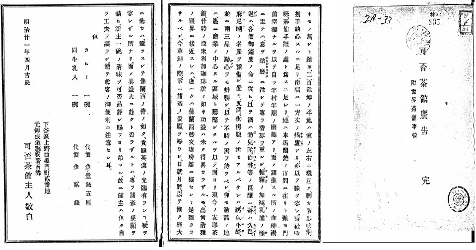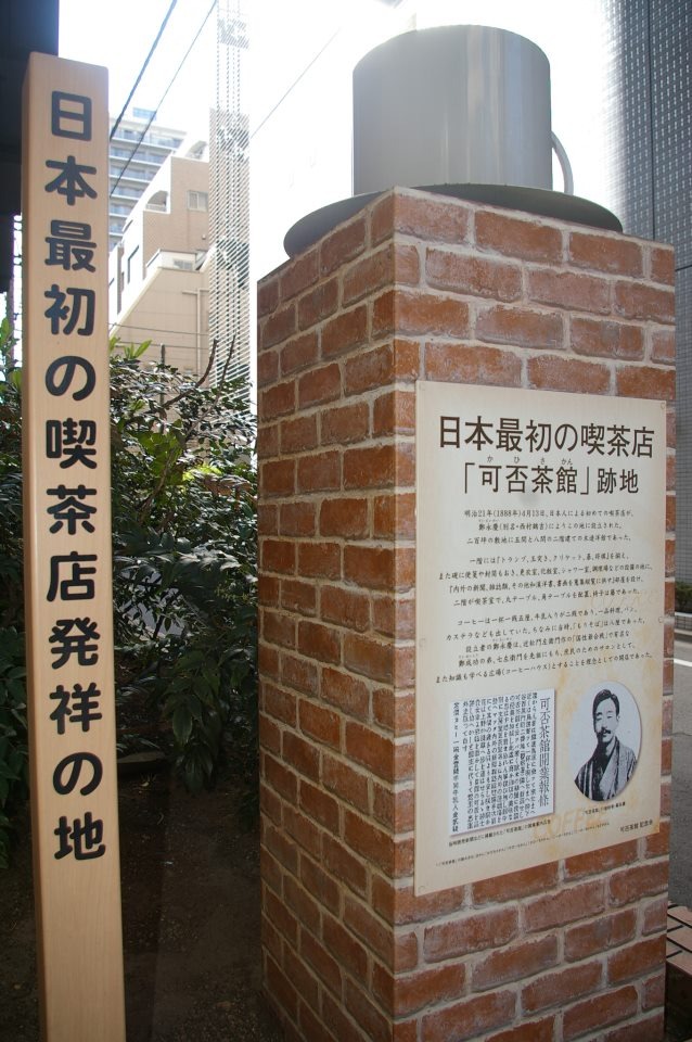 В токийском районе Ситагая, в Уэно, открылось первое в Японии заведение общественного питания, специализировавшееся на продаже кофе. Первая японская кофейня носила название «Кахи сакан» 可否茶館 («Павильон кофе и чая»). Её основателем стал предприниматель Нисимура Цурукити 西村鶴吉 (также известный как Тэй Эйкэй 鄭永慶), рассчитывавший не только на привлечение молодых клиентов, идущих в ногу со временем, за счёт удешевления напитка, ранее доступного исключительно представителям высших слоёв общества, но также на популяризацию кофейной культуры в целом. Заведение «Кахи сакан» должно было стать не просто едальней, но своеобразным клубом по интересам, где за высокую, но не заоблачную плату можно было приобщиться к западной традиции, посидеть в кожаных креслах, поиграть в бильярд, обсудить последние новости, почерпнутые из продававшихся там же японских и иностранных газет, а при желании даже ополоснуться и немного вздремнуть в специально отведённых для этого помещениях для постоянных клиентов. Заведение также было снабжено всеми необходимыми принадлежностями для курения. По замечанию журналиста Глена Клэнси (Glen Clancy), «с «Кахи сакан» началась публичная любовная связь между курением табака и потреблением кофе».