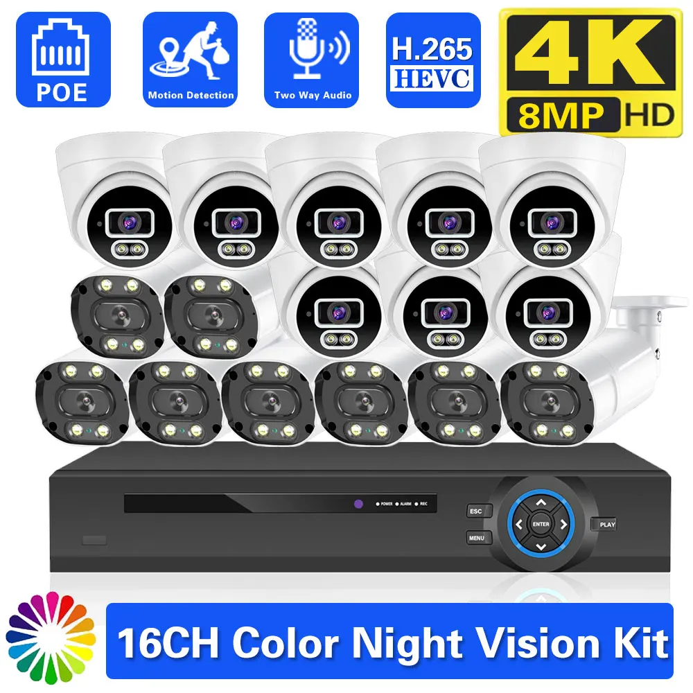 16CH POE NVR 4K 8MP Wide-Angle CCTV Security Camera System 8MP Color Night Vision Two-Way Audio Camera Video Surveillance Set - Купить с бесплатной доставкой