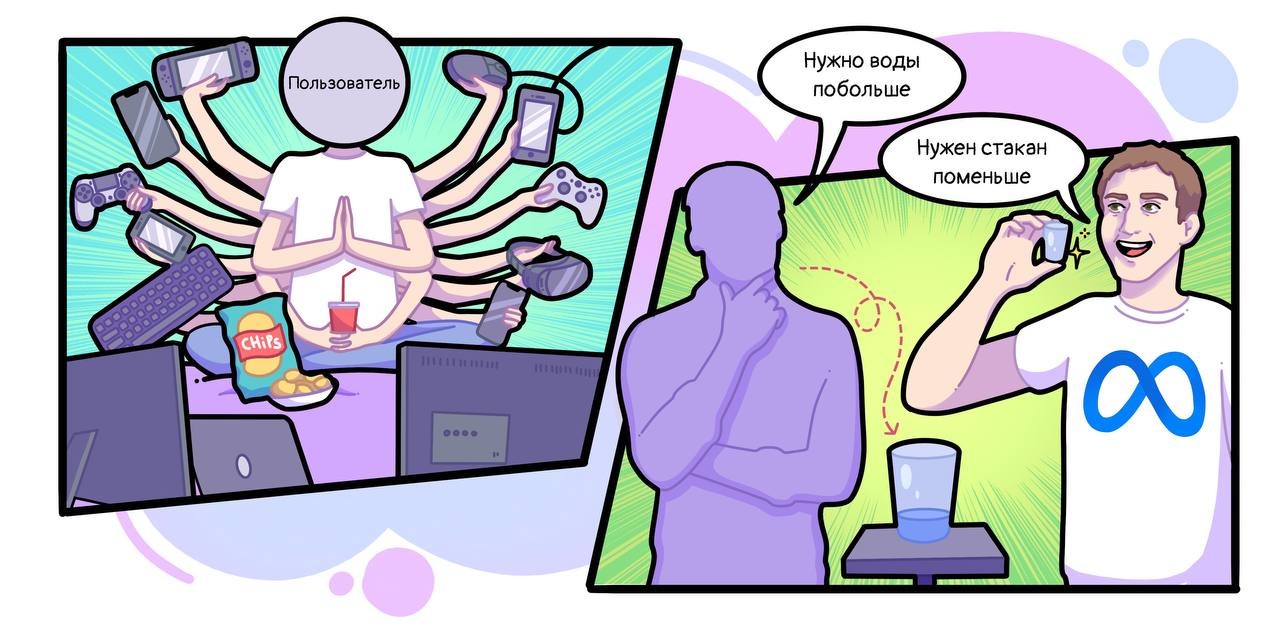 В результате весь потенциал метаверса в его анонсируемом варианте сливается в трубу. Цукерберг пытается продвигать метавселенную как полноценное дополнение/замену реального мира, где можно совершать привычные рутинные действия и зависать 24/7, а на практике пользователь получает слабо структурированные и очень дорогие игрушки, стоимость оборудования для которых начинается с 400 долларов. Неудивительно, что хайпа много, а выхлоп — почти нулевой.