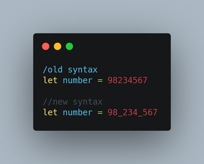 Endi raqamlarni shunchaki _ belgi bilan osongina ajratish mumkin. Bu ko'plab raqamlar bilan ishlaganda anglashmovchilikka olib kelmasligi uchun yangi sintaksis