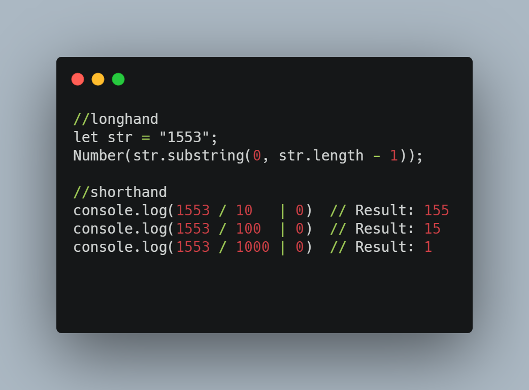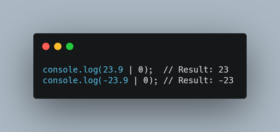 Agar float turidagi sonni butun songa aylantirmoqchi bo'lsangiz Math.floor (), Math.ceil () yoki Math.round () yoki bo'lmasa bitwise operatorlaridan foydalanishingiz mumkin lekin biz sizga undanda optimal variantni ko'rsatamiz.