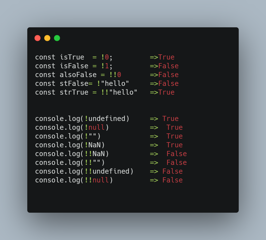 Boolean mantiqiy operatorini odatda let a=true yoki let b=false deb ishlatib o'tib ketgan bo'lishimiz mumkin. Lekin quyidagi natijalar ham true yoki false qaytarishini bilib qo'ysak zarar qilmaydi.