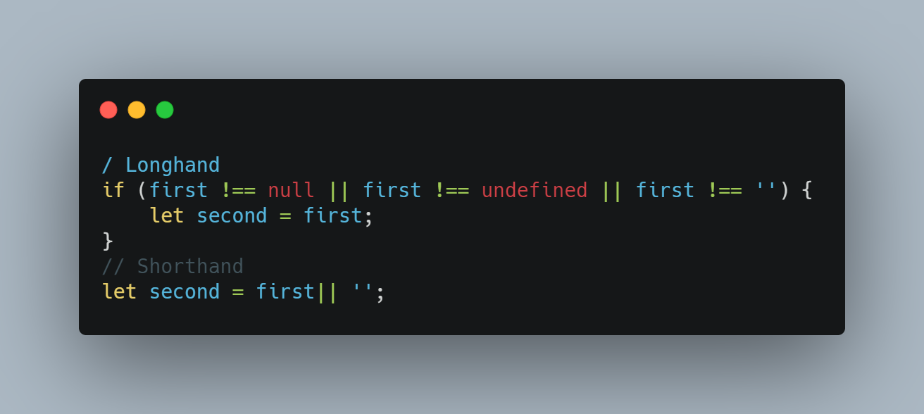 Biz yangi o'zgaruvchilar yaratganimizda, ba'zida biz uning qiymati uchun murojaat qilayotgan o'zgaruvchining nol yoki aniqlanmaganligini tekshirishni xohlaymiz. Ushbu funksiyalarni tekshirish uchun JavaScriptda juda yaxshi stenografiya (qisqaroq yozish usuli) mavjud.