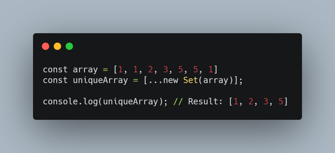 Set obekti turi ES6 da joriy qilingan va spread operatori yordamida massivdan bizga takrorlanmagan elementlarni bizga qaytarib beradi. (Rest va Spread operatorlari haqida keyingiz maqolamizda tanishib o'tamiz)