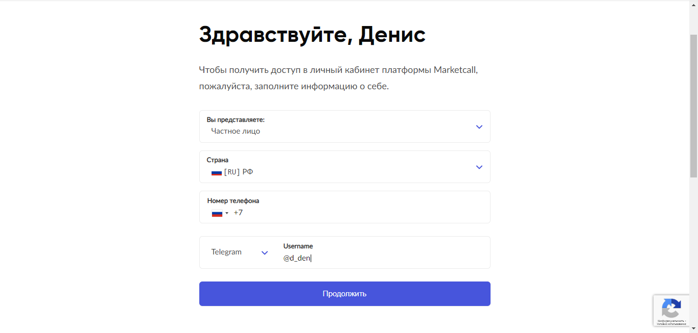 Переходим к следующему шагу, заполняем свой номер телефона и указываем ник телеграм.