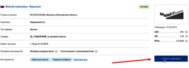 Отправляете созданную рекламную компанию на модерацию. Ждете, когда ее одобрят и переходите к следующему шагу. Если компанию не одобряют или же вы не можете найти рекламные материалы для компании, пишите менеджеру МаркетКолл, он поможет решить вопрос.