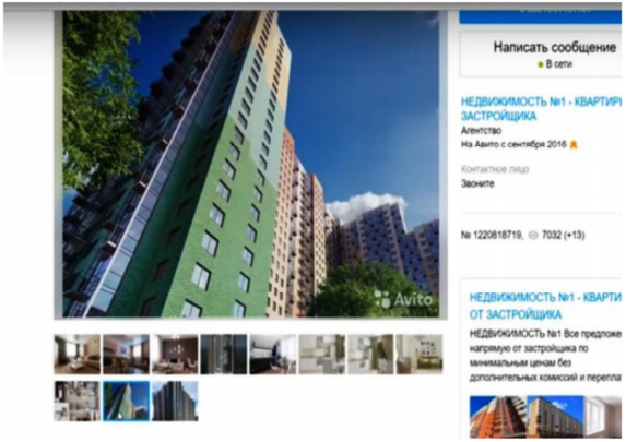 Видно, что размещено много фотографий различных зон квартиры, а также видна планировка и дом, где предлагается приобрести квартиру целиком.