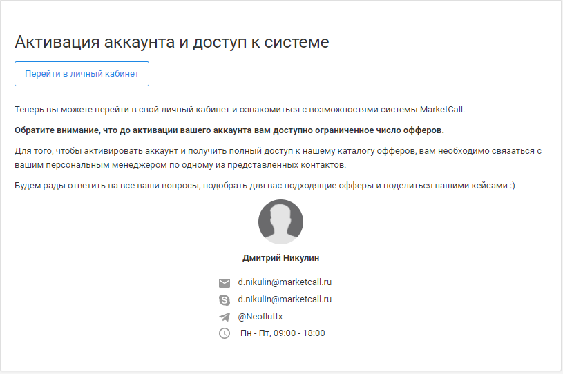 Регистрация окончена, но доступ к заработку у вас ограниченный, чтоб открыть полный доступ, Вам нужно написать менеджеру Маркет Колл по контактам с просьбой открыть полный доступ.
