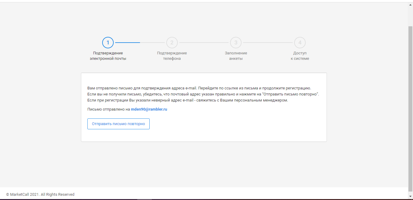 Подтверждаем нашу почту. Чтоб подтвердить почту, необходимо зайти в свою почту, найти письмо от МаркетКолл и кликнуть по ссылке в письме. (если письмо не пришло, посмотрите его в папке "Спам")