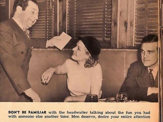 But one of the most surprising discoveries from taking a nostalgic look at the 1950s involves the strict "rules" of courtship . Back then, rules like "never drop your silverware on a first date" weren't seen as overly strict β they were just the norm . ADVERTISEMENT . Don't sit in awkward positions and never look bored .