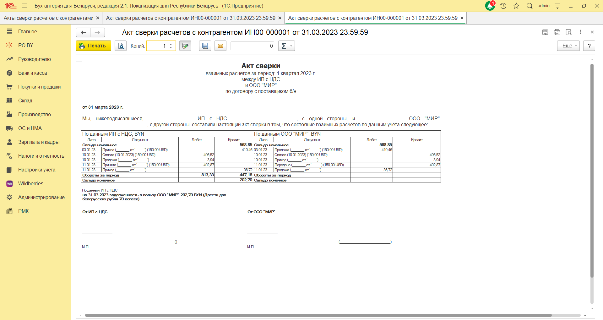 1с 7.7 акты сверки