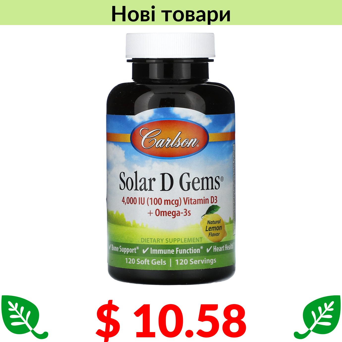 $ 10.58 Carlson, Solar D Gems, Natural Lemon, 100 mcg (4,000 IU), 120 Soft Gels