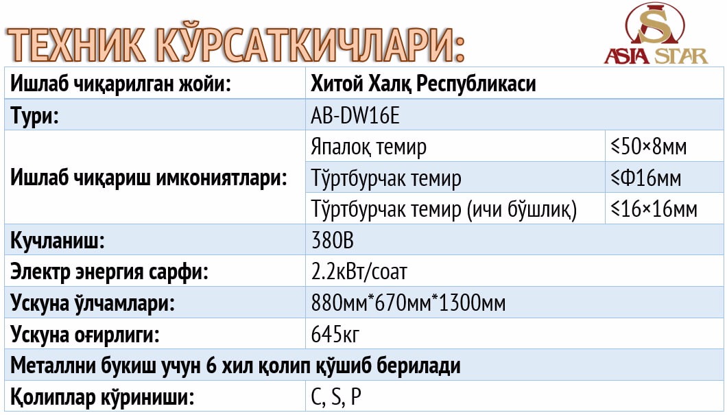 МЕТАЛЛНИ БУКИБ БЕРИШ УСКУНАЛАРИУзбекско-Китайский Торговый Дом "ASIA STAR" - Оборудование для ковкиНАРХИ ТОШКЕНТ: 2990USDНАРХИ ТОШКЕНТ: 2670USDНАРХИ ТОШКЕНТ: 2200USD Скачать видеоНАРХИ ТОШКЕНТ: 1170USDНАРХИ ТОШКЕНТ: 2030USD