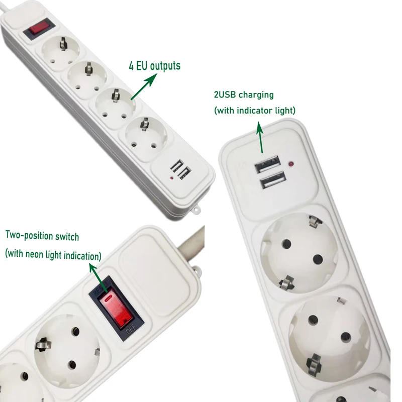 "2 Round Pin EU Socket Power Strip Switch EU Plug With 1.4M/1.8M//2M/4.8M/ Extension Cord Surge Protector 3/4 AC Outlets 3/2 USB" * Buy Now Just For 9$