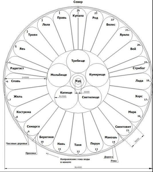 Вокруг рощи прорывали канал, движение воды в котором создавало закрученность пространства. В дни благоденствия, когда вода в канале текла посолонь, люди получали благодать от Богов. Когда славили Богов(своих предков), воду, за счёт устройства шлюзов, в канале направляли противопосолонь (против солнца) и закрученность способствовала передаче наработанной энергии вверх, где концентрируется Божественный эгрегор.