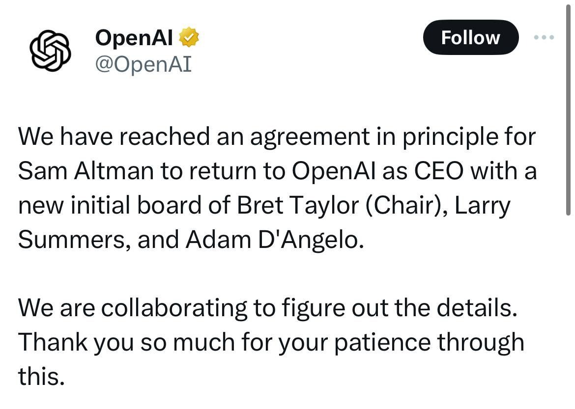 18 ноября появились слухи о возможном возвращении Альтмана в компанию. Дополнительно вскрылось, что из крупных коммерческих инвесторов никто, включая Майкрософт, ничего не знал — да и сами Сэм с Грегом узнали о своей отставке едва ли не из новостей. Сатья Наделла, СЕО Майкрософта, обещает поддержать Альтмана в будущем, учитывая его планы по возможному созданию новой компании. Тут отметить, что OpenAI еще не получила полный объем инвестиций от Microsoft на $10 миллиардов, и большая часть этих инвестиций представляет собой кредиты на облачные услуги, что дает Microsoft значительное влияние на OpenAI.