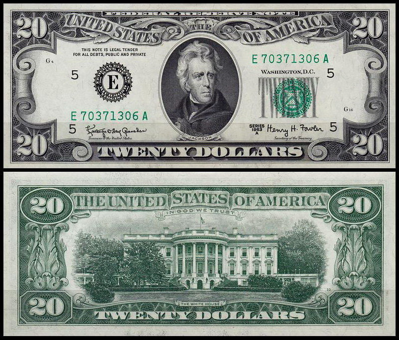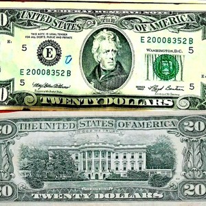 Двадцать долларов США — банкнота США . . Выпускается Федеральной резервной системой США .На аверсе банкноты изображен 7-й президент США Эндрю Джексон, на реверсе — фасад Белого дома со стороны 16-й авеню .
