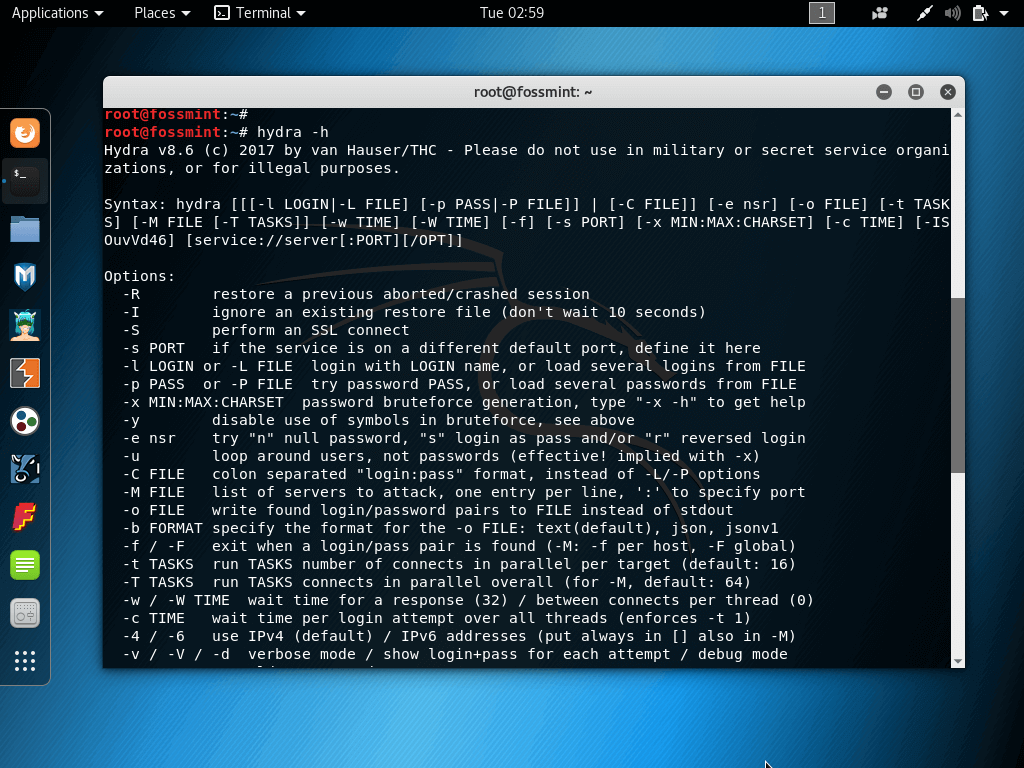 THC Hydra использует атаку методом «грубой силы» для хакинга практически любой удалённой службы аутентификации. Поддерживает скоростные переборы по словарю для 50+ протоколов, включая Telnet, HTTPS и FTP.