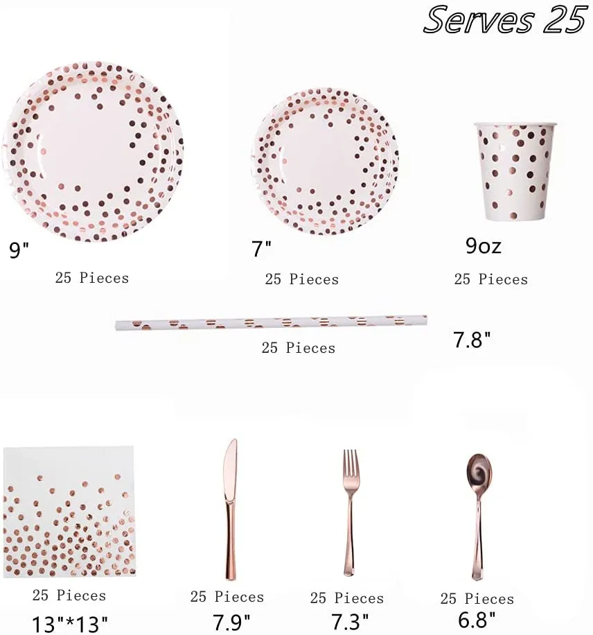 «200 PCS Serves 25 Rose Gold Dot Tableware Set,Disposable Party Dinnerware Kit Paper Straws Napkins Plates Cups Cutlery Wedding» по лучшей цене на рынке! Всего за 37$ (3515рублей)
