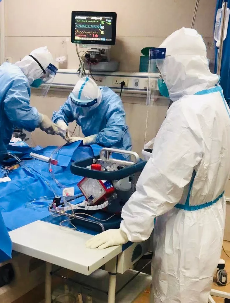 这两天他接诊了一位45岁的病人,病人一家五口,父母两个皆因新型冠状病毒肺炎去世了,儿子也感染了。病人的情况十分严重,用了高流量吸氧和无创面罩通气,但血氧饱和度还只有50%,最后不得已给她麻醉插管,上了ECMO(体外膜肺氧合)。