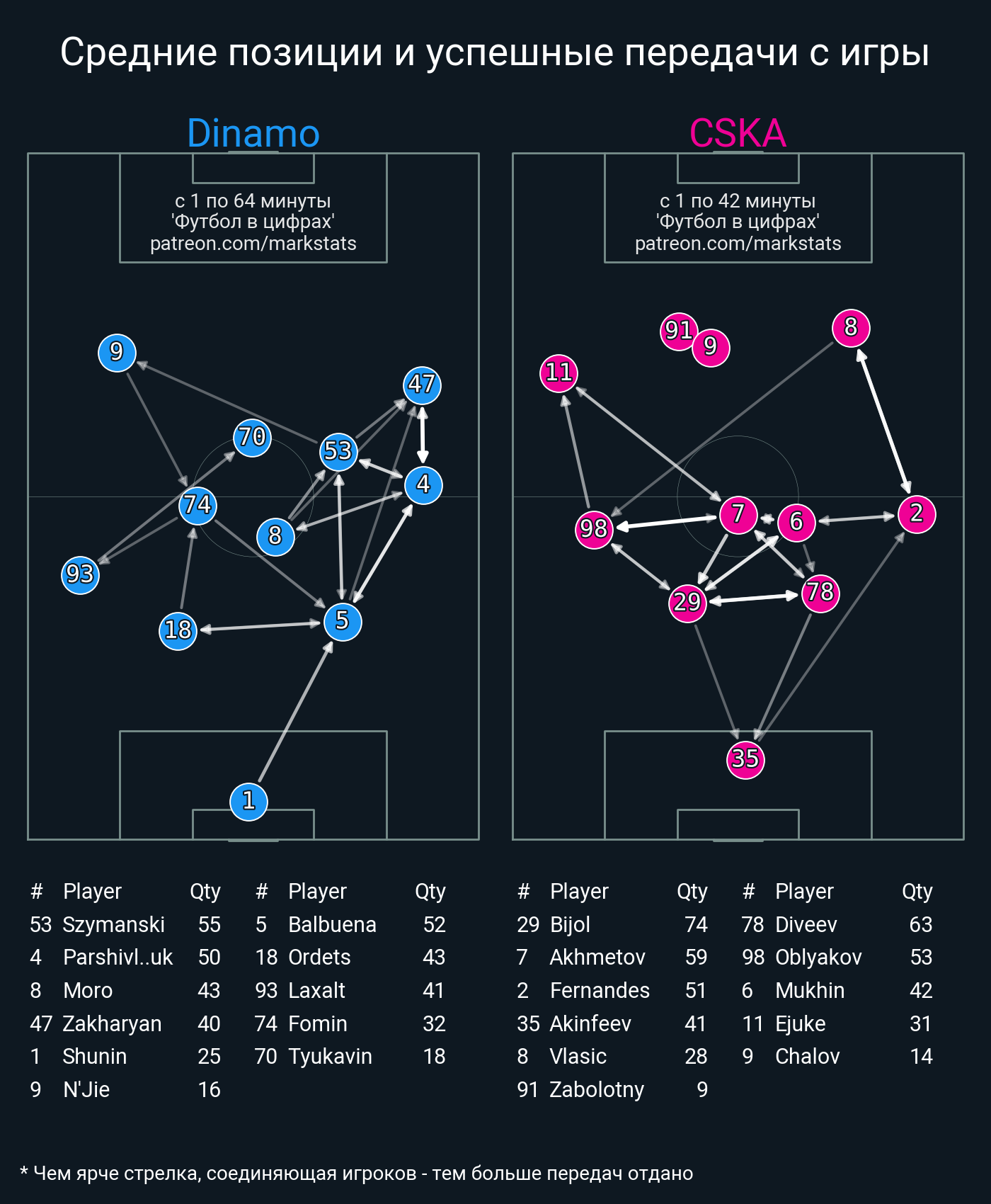 ▪ 51 успешных передач из 64 попыток (2 под удар, 4 с продвижением, 6 на трети соперника)