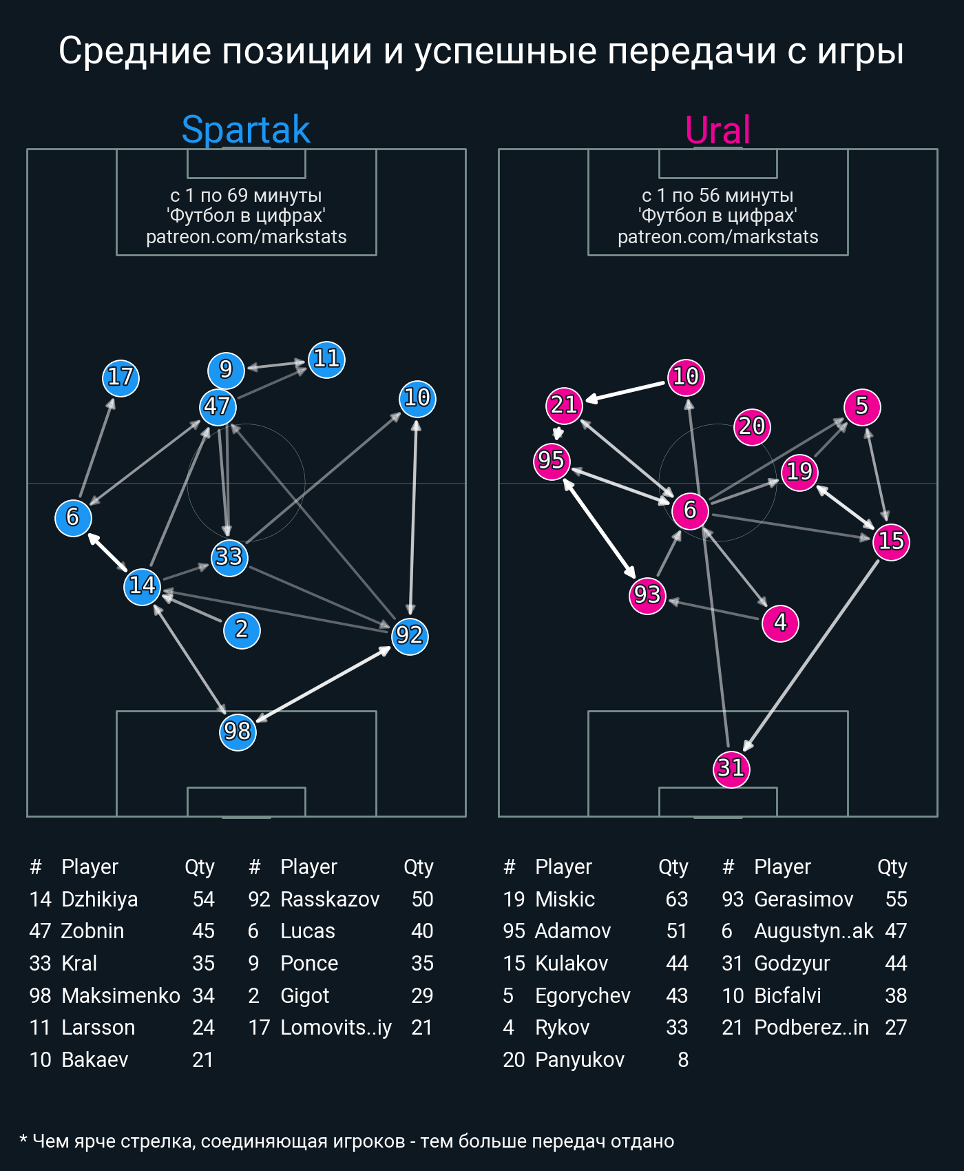 ▪ 42 успешных передач из 55 попыток (7 с продвижением, 10 на трети соперника)